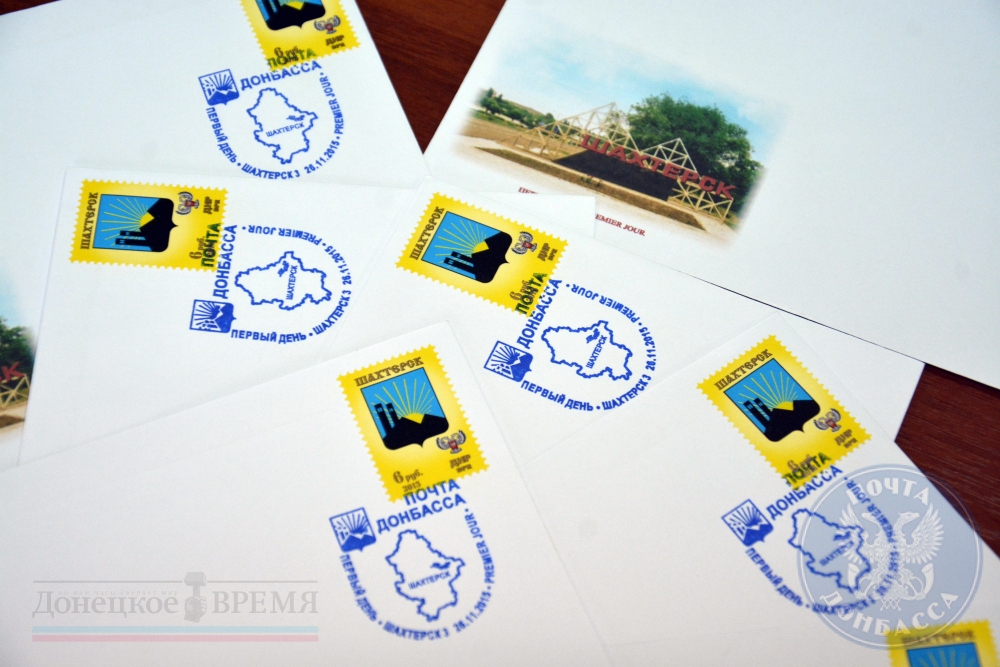 ГП «Почта Донбасса» вводит в обращение стандартную почтовую марку первого выпуска «Шахтерск» с обозначением номинала 6 рос. руб. 00 коп. и проводит специальное гашение с использованием памятного календарного штемпеля и конверта первого дня «Шахтерск».